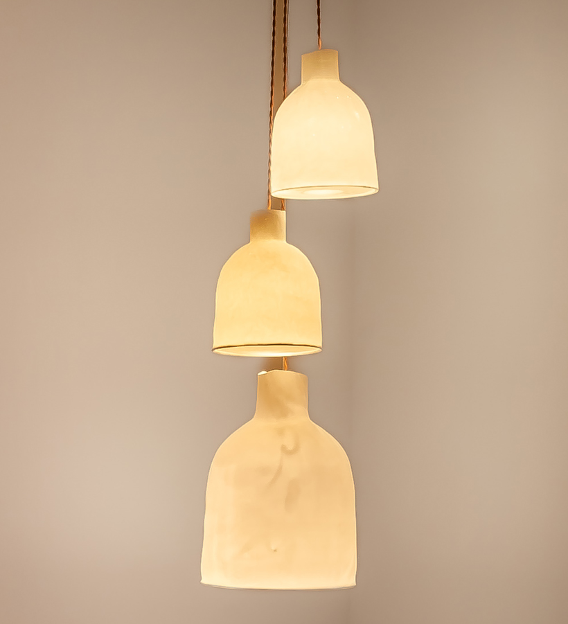 The Bells are moulded by hand and cast in bone china clay giving them a soft and appealing texture and slightly irregular form. The nature of the material gives and an unexpected glow when the lights are lit. They are available in two sizes medium or large with a flat or open bottom. The cluster can be from one size or a mix of medium and large with a minimum of 3 lamps or more. Various coloured cords are available.