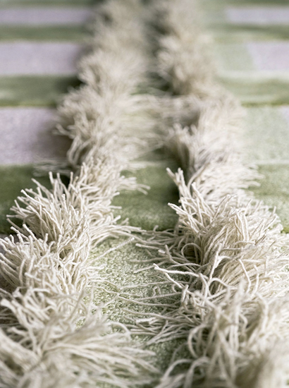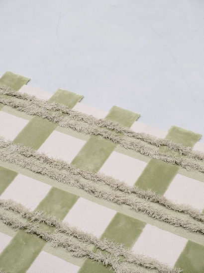 Brace features a bold, over-sized grid in a pared back, mono-colour palette. The grid is visible through contrasting textures of eucalyptus fibre. Areas of low, looped pile boast a curly, sheen in contrast to longer, velvet and fringe sections. The simple graphic gains complexity through materiality, resulting in a kind of ‘textural plaid’. The central grid graphic extends beyond the rug’s outer perimeter, bringing it a step closer toward ‘object’ territory. Bold in graphic form, but gentle in colour, Brace is an exercise in tactility and restraint with subtlety and nuance employed to showcase the luxury of the material.