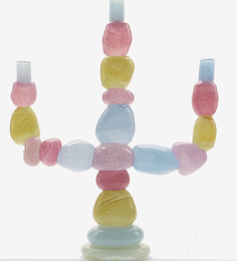 The making of this unique glass piece is infused with an innate sense of play. The designer allows the glass to perform in an organic way, informing the overall shape of the piece. Sculpting the molten glass as its drips, rolling it into various shapes and forms, the outcome of the Candelabra is characterised by vibrant colours, transparency, and a shimmer that invokes a childlike wonder and joy.