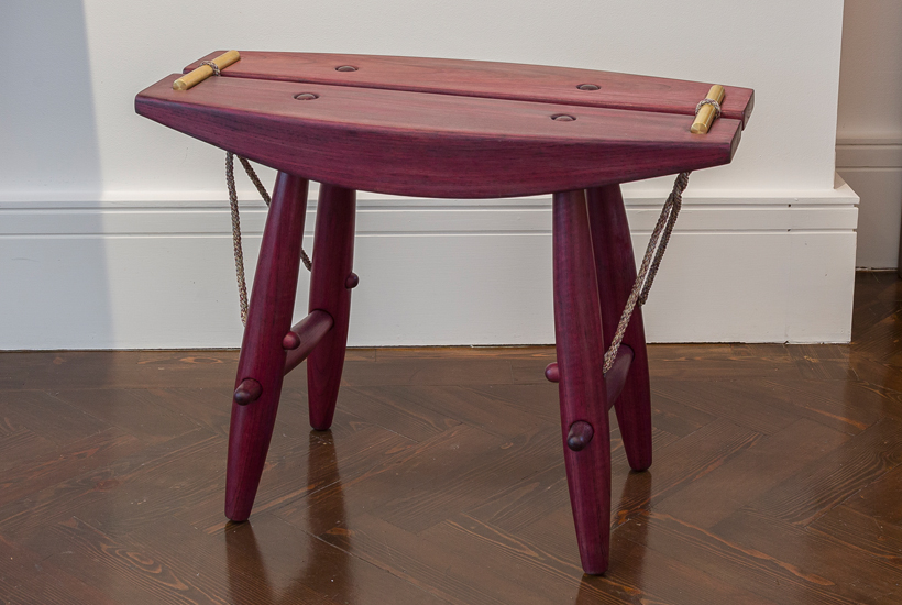Care Stools are made of Brazilian satinwood and purpleheart. The piece is one of several inspired by CearĂ¡, a state in North Eastern Brazil. With a handmade rope giving rigidity and ensuring the stability of the furniture, the polished brass turnstile fits perfectly on the sides of the seat. This unique wood has not been stained or dyed and remains its natural colour.