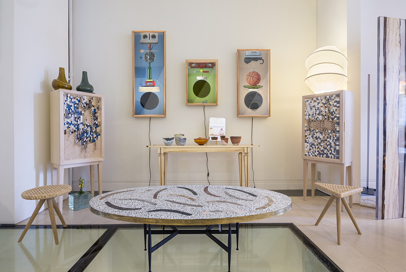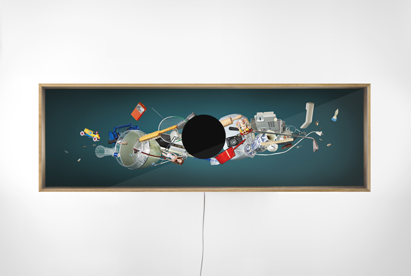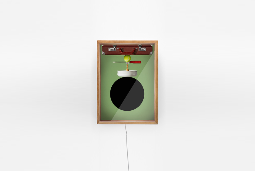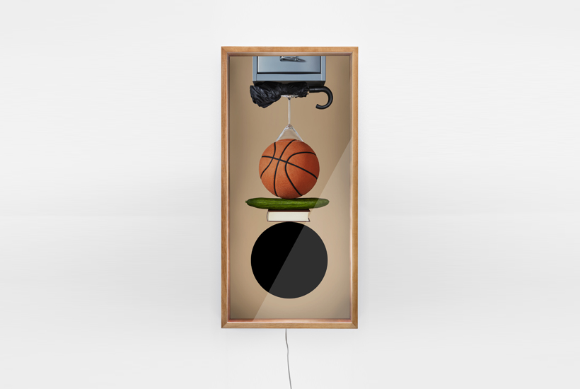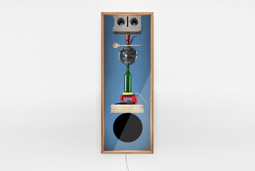 ‘Carrying the World on My Head,’ is an exploration of one’s reflection; with the light turned off the whole object acts as a mirror. However, once the light is turned on, only one’s face can be seen within the black circle, while a materialistic tower of photographed objects appears above the reflection. Thus, posing the question to what extent do our belongings determine our self-image.