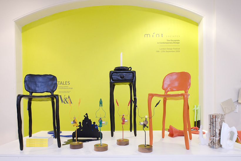 A colourful and playful range of chairs with a deceiving fragile appearance. The structure conceals a thin metal skeleton on top of which industrial clay has been applied by hand. This technique of modelling originally employed in rendering the human form, gives the chair a fantastic sculptural quality.