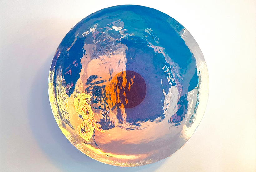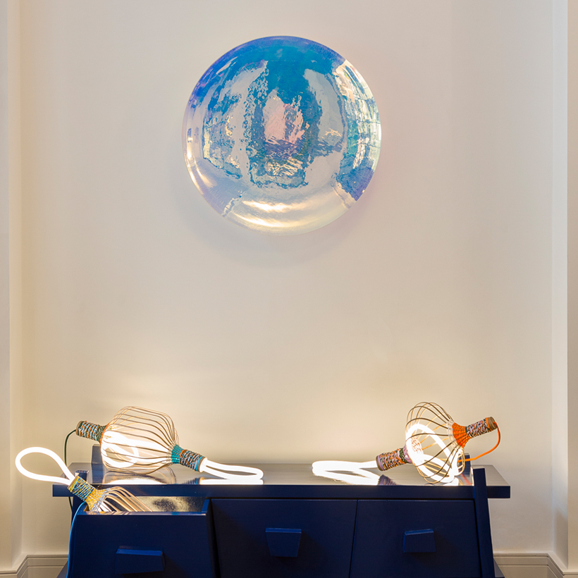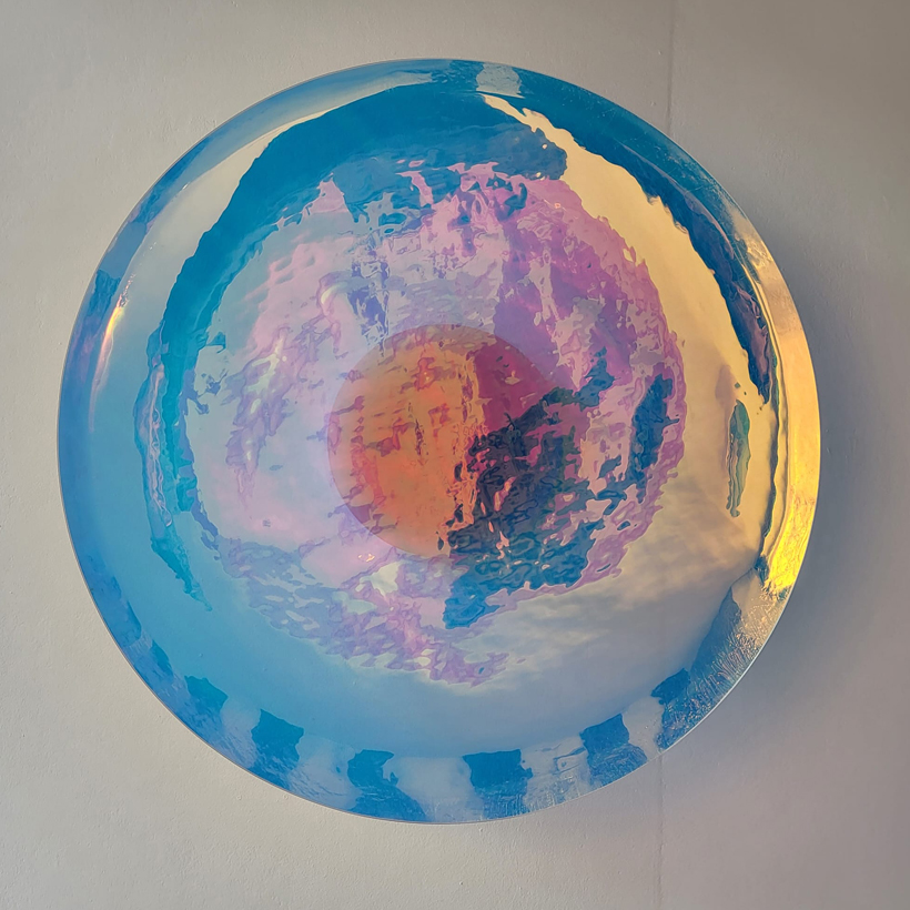 'Colour Worb' is part of Sodalime's limited production of 12 pieces. Dichroic glass, otherwise known as two-toned glass, is often used in camera and lighting lenses, it is produced through a unique and fully automated dipping technique. Sodalime have sought to celebrate the striking appearance and remarkable characteristics of this material through their collection, ‘Dichroic’. The spectator is invited to investigate the objects through movement, where each new perspective changes the colour pallet, invites interaction, and challenges perception.