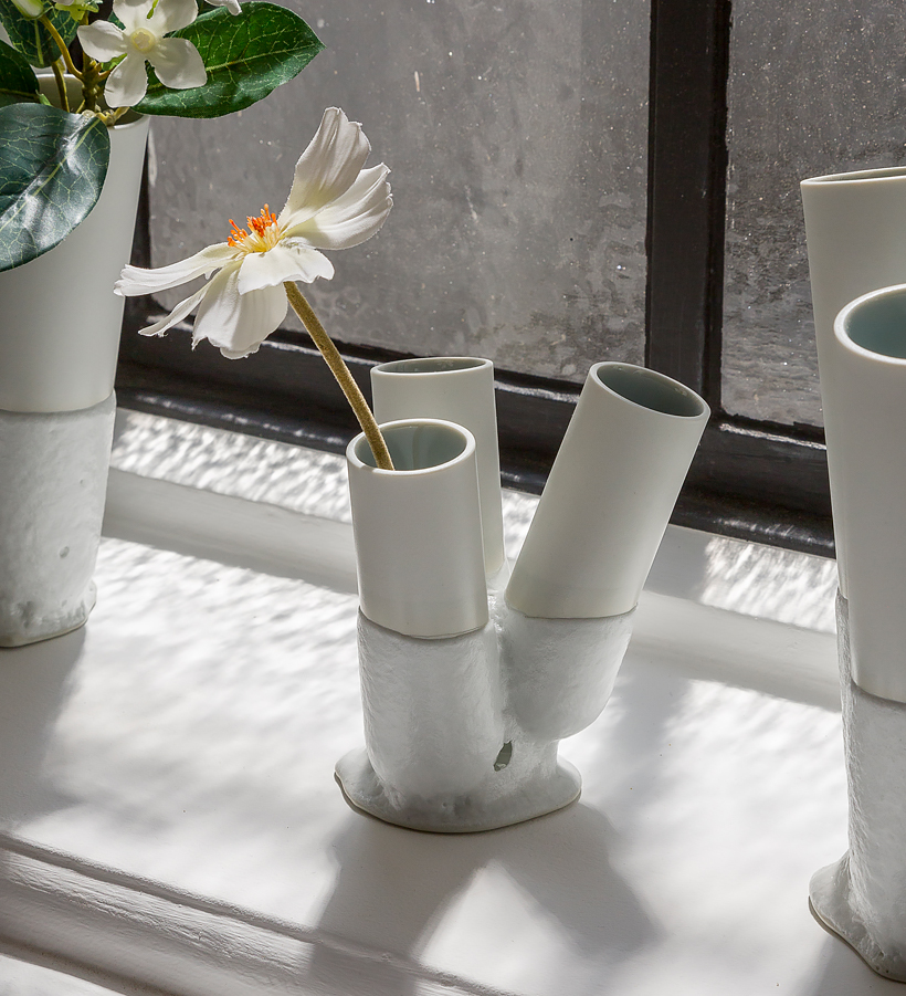 These fun and playful vases are hand crafted with an internal transparent glaze. This not only acts as a functional feature but also creates a subtle contrast between a soft matt and glossy ceramic texture. Once the vessels are fired the pieces are dipped into a foam material that expands during the heating process. This bonds the vessels together and adds a sculptural flare that eludes to natural formations.