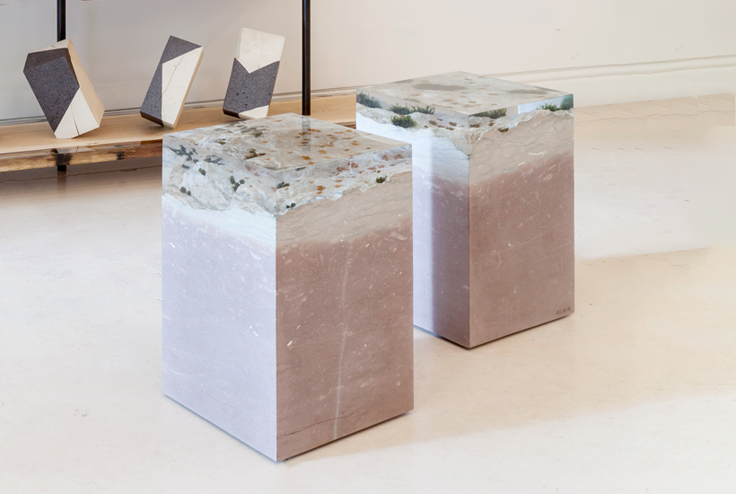 Dolomyth aims to capture the complex relief of the Dolomite. A block of stone is extracted from the ground and resin is poured to preserve the native moss and lichens on the surface. Layers of sedimentation are clearly visible and range from antique pink to grey. A preserved piece of nature, which is sculptural and equally functional.