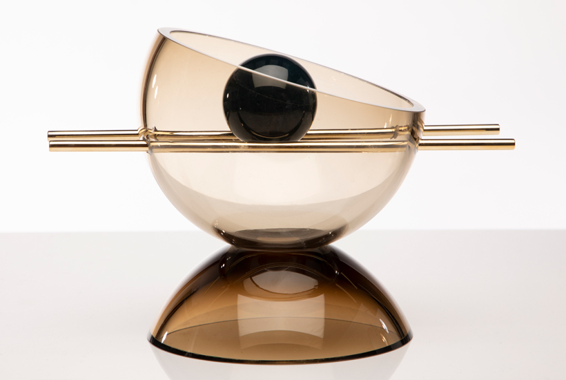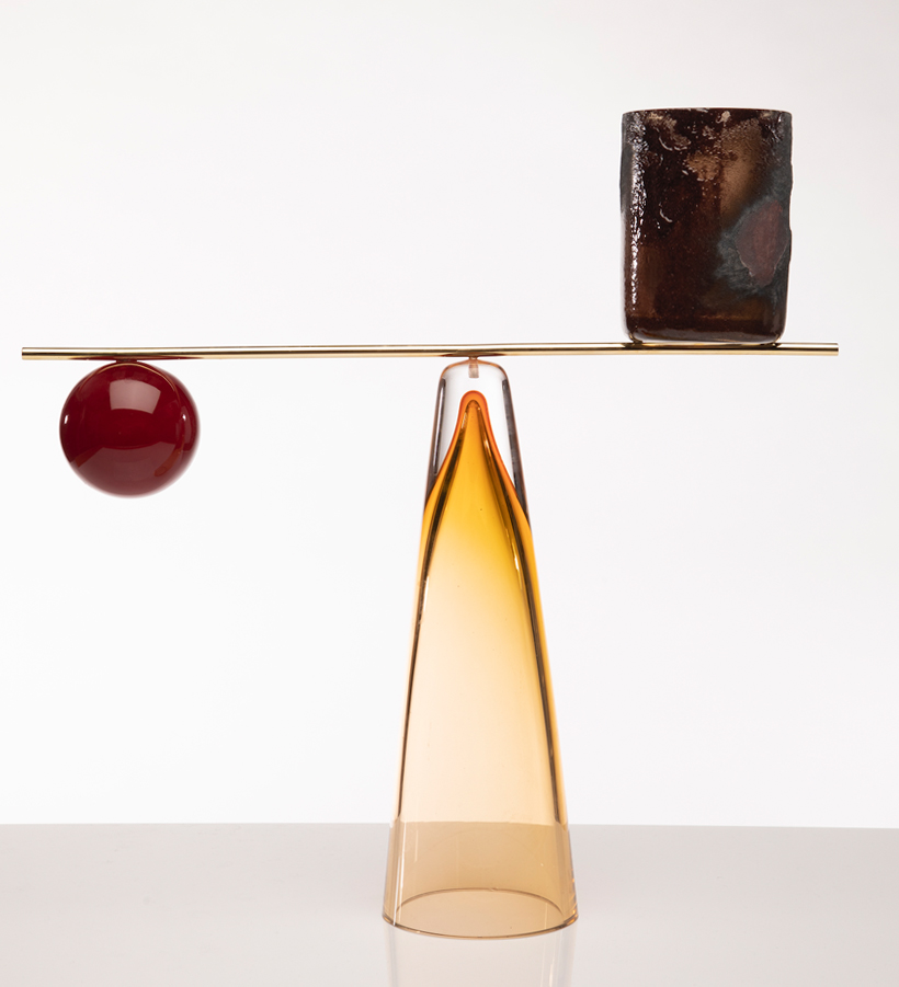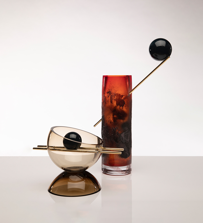 This sculptural glass collection speaks to the material innovation created by fusion of glass and metal. This collection features glass balls suspended beneath brass rods, with a mix of glued and balanced elements that can be arranged in various ways. Metal powders add texture to the glass, creating a contrast with the high gloss surfaces. This collection of glasswork challenges conventional notions of beauty, demonstrating that glass can be eye-catching without conforming to stereotypical standards.