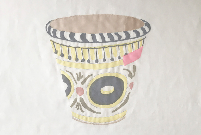 These hand-embroidered sketches are created from hand drawings using layers of silk organza over linen or cotton. Emily uses flat blocks of colour which provide a graphic quality, whilst layering different fabrics which provides depth and perspective, bringing the pieces to life. These pieces are inspired by her Grandfather's majolica flower pot; their cracked surfaces which have been stuck together in places with pink tape is depicted within the colourful organza layers.