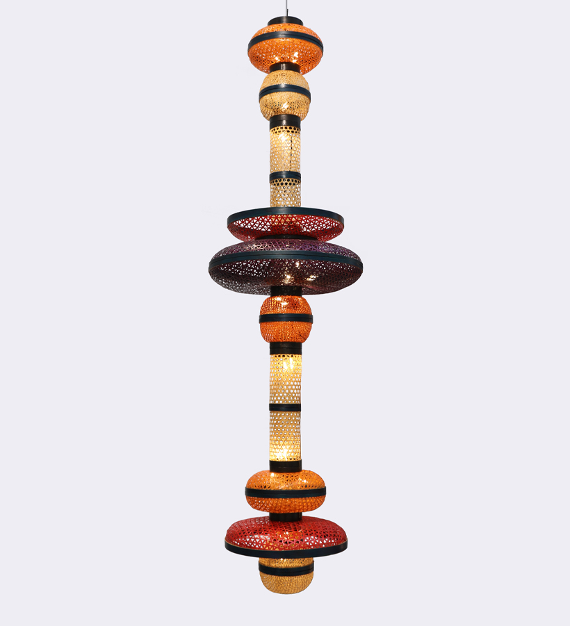 The design aims to accentuate the inherent flexibility of bamboo. It is carefully crafted to allow for variations in color, patterns, and sizes. This striking piece blurs the line between decorative and technical lighting, with the intention of altering our perception of sustainable interior lighting.