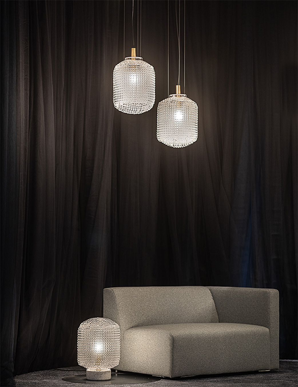 Crystal-clear blown glass "cage" and marble