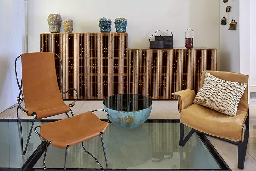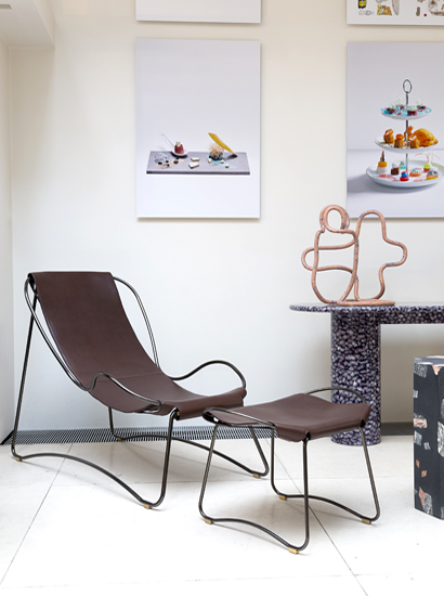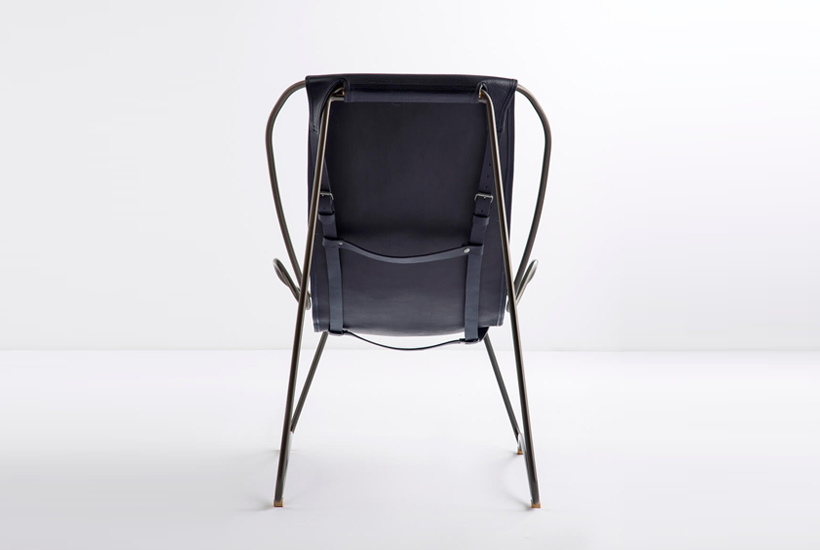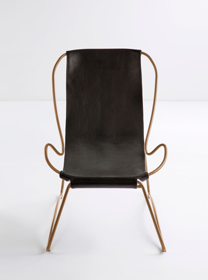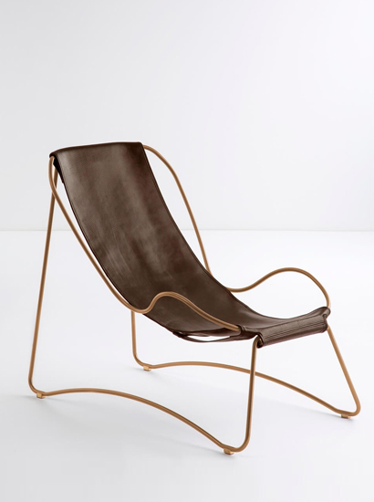 The Hug contemporary chaise lounge is designed and conceived with a light aesthetic; the slight oscillation of the steel rod is complemented by the flexibility of the premium vegetable tanned leather. When sitting in this furniture you feel an enveloping sensation, like being hugged, since the weight of the body is distributed evenly. Each unit becomes a refuge of visual and ergonomic wellbeing. The lines of a landscape, the curves of nature, and the imaginary silhouette of the wind inspire this collection of organic forms, almost like metallic sculptures.