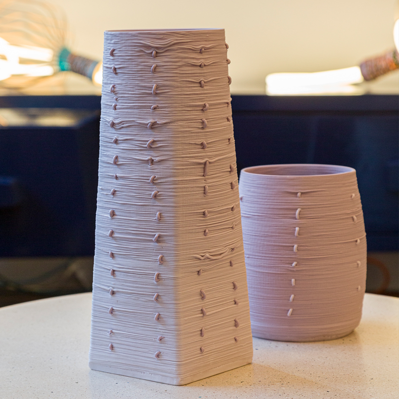 NNN is interested in reconnecting design with human touch. The designer implements a human element into the printing script by weaving coiled clay into the vessels while they are printing. Intervening in the ceramic 3d-printing process, creates opportunities for intentional disruption, structure change and beautiful accidents. Thus, no two prints are ever identical. NNN is a celebration of organic manmade error and the presence of humanity into the man-made machine; the resulting works offer richly textured surfaces and unfamiliar volumes.