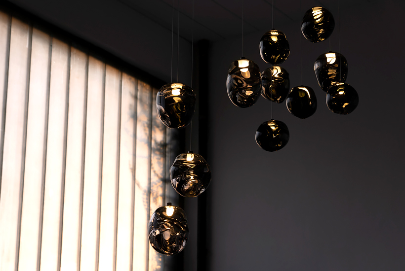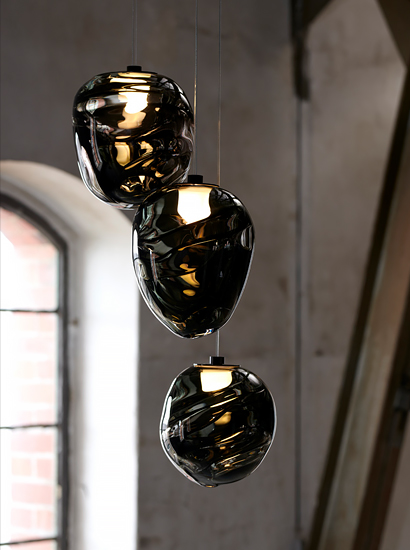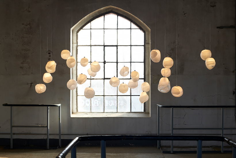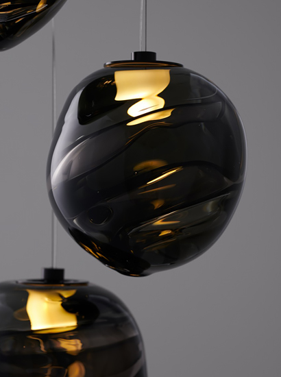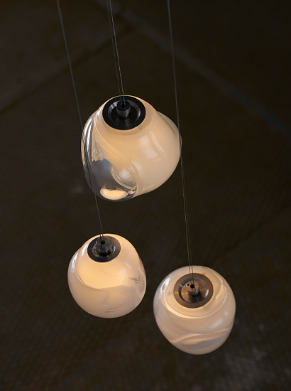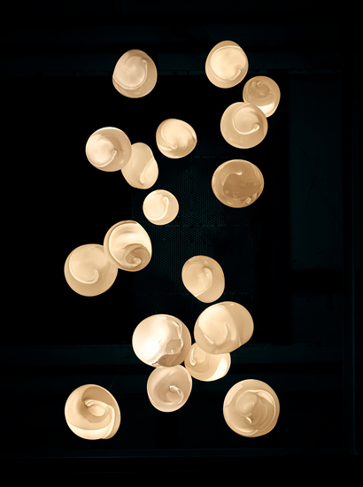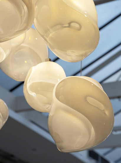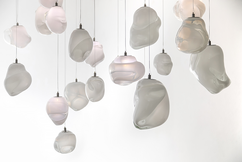 The installation features a cluster of hand-blown glass lighting elements accentuating glass as an amorphous substance. The glassblowing is manipulated to show movements relating to the human body. Each glass volume is unique and expresses the parallel between static and fluid.
