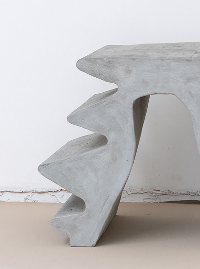 For this collection, the designers developed a unique mould making process to produce concrete furniture. The technique exploits an unconventional but completely reusable mould material, which avoids often wasteful practices within the concrete industry. The rippled forms created are completely individual; no one piece is the same and each can have multiple functions for interior or exterior uses. The process dictates that multiple items are poured at the same time. The pieces interlock with one another creating three-dimensional puzzles where components often fit together on different planes.