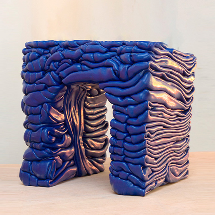 This beautifully crafted stool offers a bold and playful aesthetic to brighten your space. The designer has worked to create a new sustainable material which uses large quantities of industrial PVC waste from Korea. This piece charmingly illustrates that beauty can be found in a material traditionally considered useless.