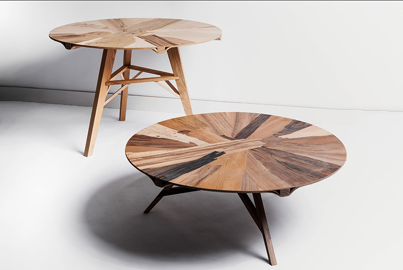 Winner of the ARC19 award for best piece of furniture: ‘Re-veneer Dining Table’ is crafted from discarded veneer parts. The technique stems from the industrial process of laminating, where a sheet of wood is used to cover the less attractive material underneath. Here, veneer is pressed and used throughout the whole object, to create unique and striking compositions.
