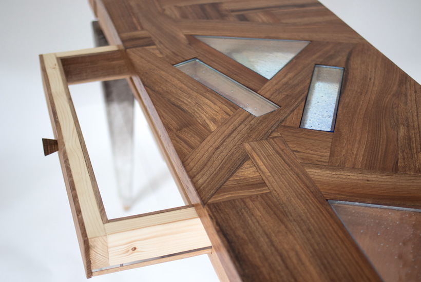 Sand Senses is inspired by the limitless qualities of sand. Sand naturally comes from the earth, when heated to high temperature it becomes transparent and turns into glass while cement incorporates more than one type of sand. The materials come together in a walnut structure which soft surface is obtained by sandblasting. The console tabletop shows geometrical features with in-lays of coloured Murano glass.