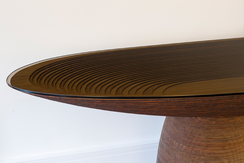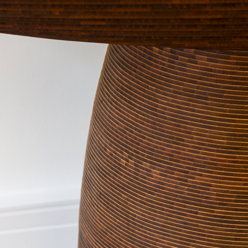 Created using an innovative technique, Daan's furniture requires only small amounts of veneer, economically stacked to create hollow, conical objects which minimises material usage and reduces waste compared to traditional wood forming techniques. By laser-cutting or water jetting bamboo sheet material into concentric layers and meticulously assembling them by hand, De Wit creates organically shaped objects which are finished with a smoked glass top, for an elegant aesthetic.