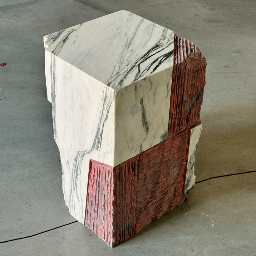 This piece is made from the process of subtracting material from a given shape transforming the original material into a work composed of two distinct elements: the original and the "new" material, defined by the texture created and colour added during sculpting.