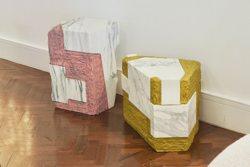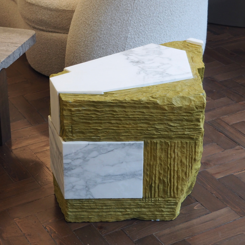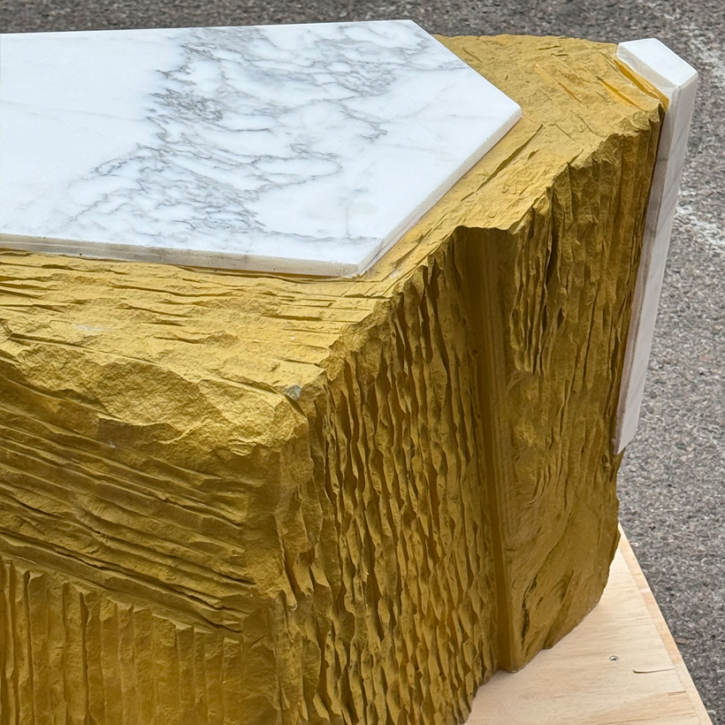 This piece is made from the process of subtracting material from a given shape transforming the original material into a work composed of two distinct elements: the original and the "new" material, defined by the texture created and colour added during sculpting.