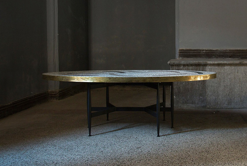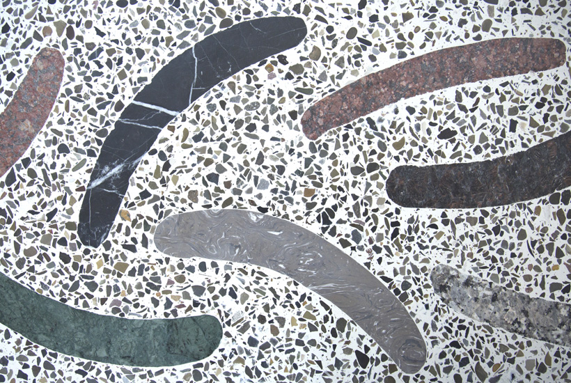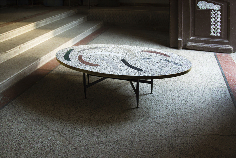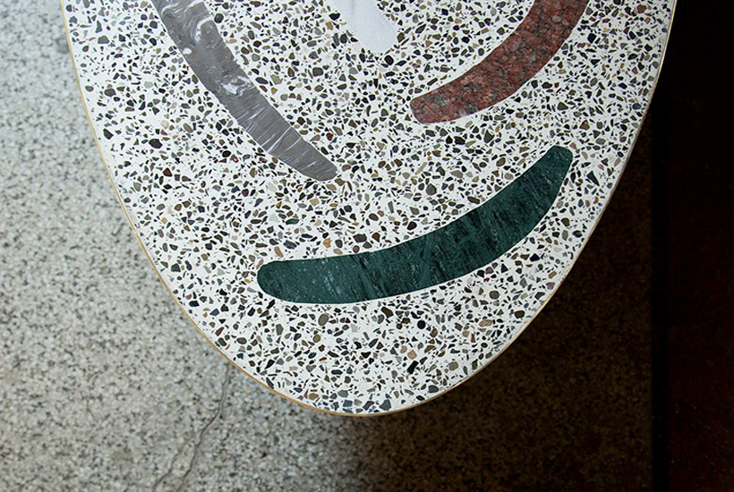 Terrazzo top, stone marble and granite inlays, oxidized brass, powder coated steel base