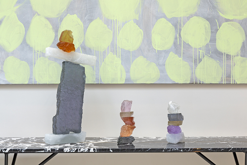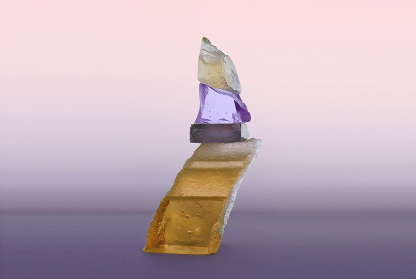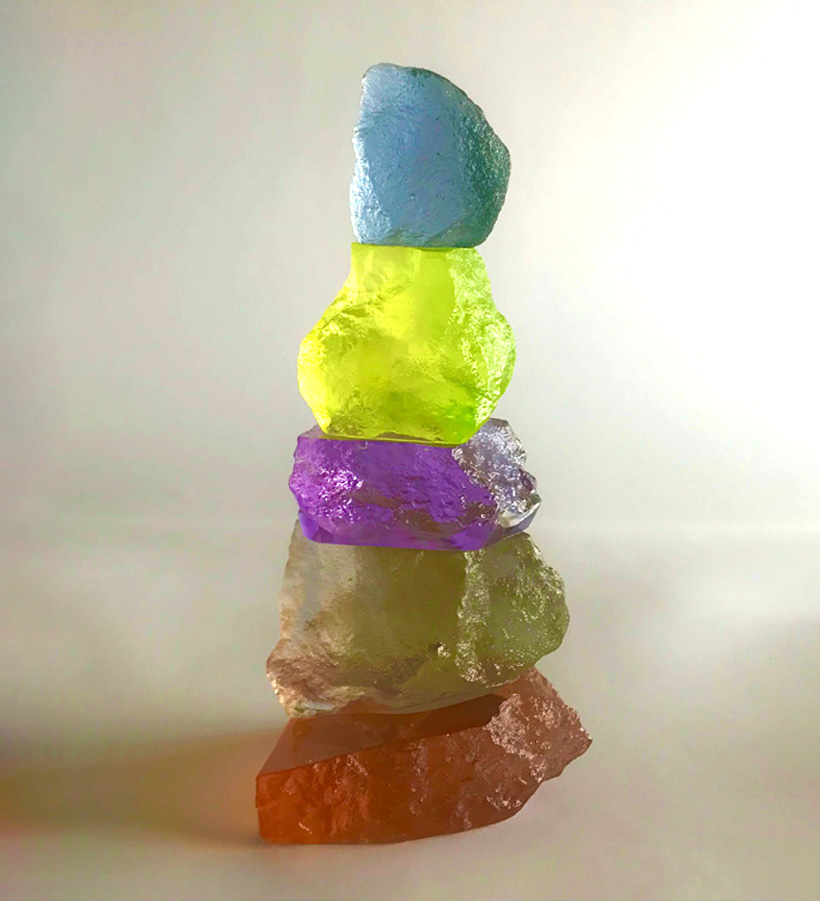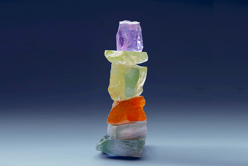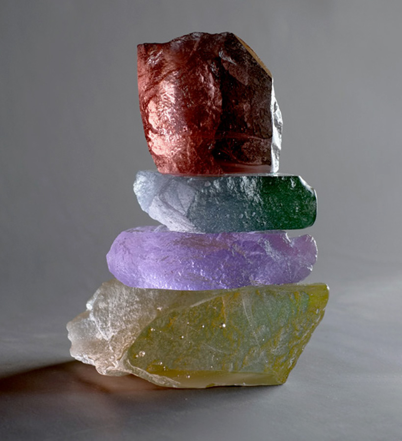 Time Rocks are made of kiln-formed Dichroic glass. The cast glass is embedded with gold and silver metallic nano-particles that change colour in response to changing lighting conditions. The intriguing glass pieces resemble rocks and architectural remnants. The pieces communicate time changes by tracking subtle and subliminal changes in our surroundings.