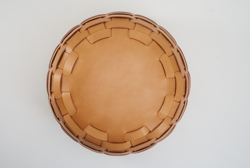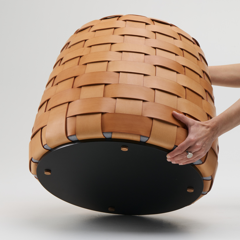 Trama, is a soft pouf in genuine hand weaved leather that recalls the simple but at the same time complex form of an upside-down nest, where warp and weft are interwoven in curves and shapes hand-modelled one by one in an artisanal and sculptural work by the designer herself, to obtain the desired shape.
