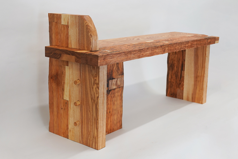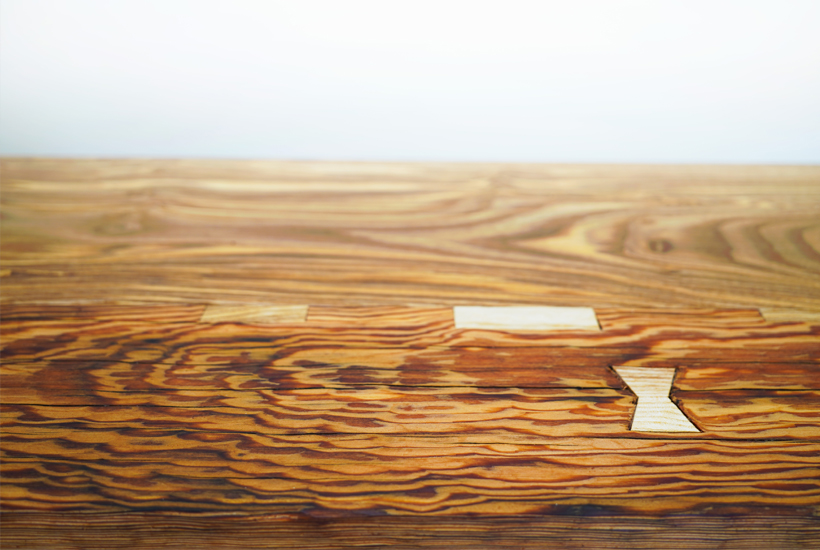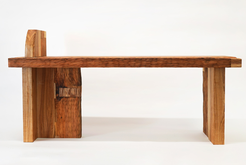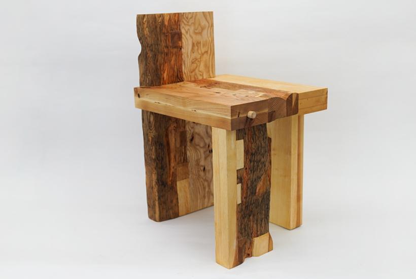 ‘Tsuguki’ is inspired by Japanese restoration of historical wooden architecture. Beams reclaimed from hundred-year-old farm barns are processed by hand and joined with new wood to create sculptural furniture, giving them a second life while keeping their histories.