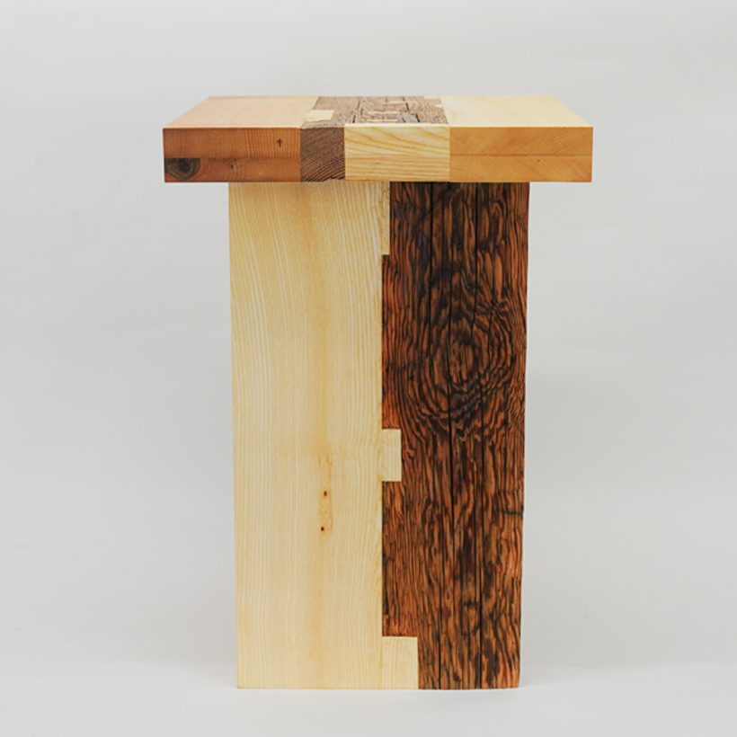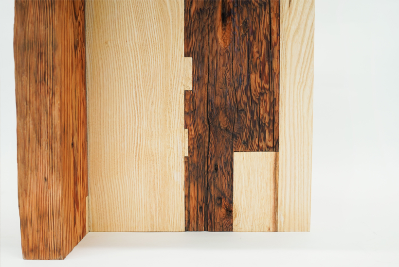 ‘Tsuguki’ is inspired by Japanese restoration of historical wooden architecture. Beams reclaimed from hundred-year-old farm barns are processed by hand and joined with new wood to create sculptural furniture, giving them a second life while keeping their histories.