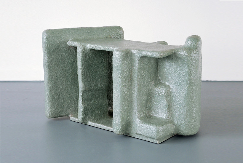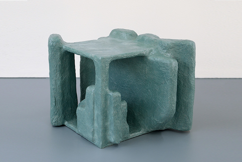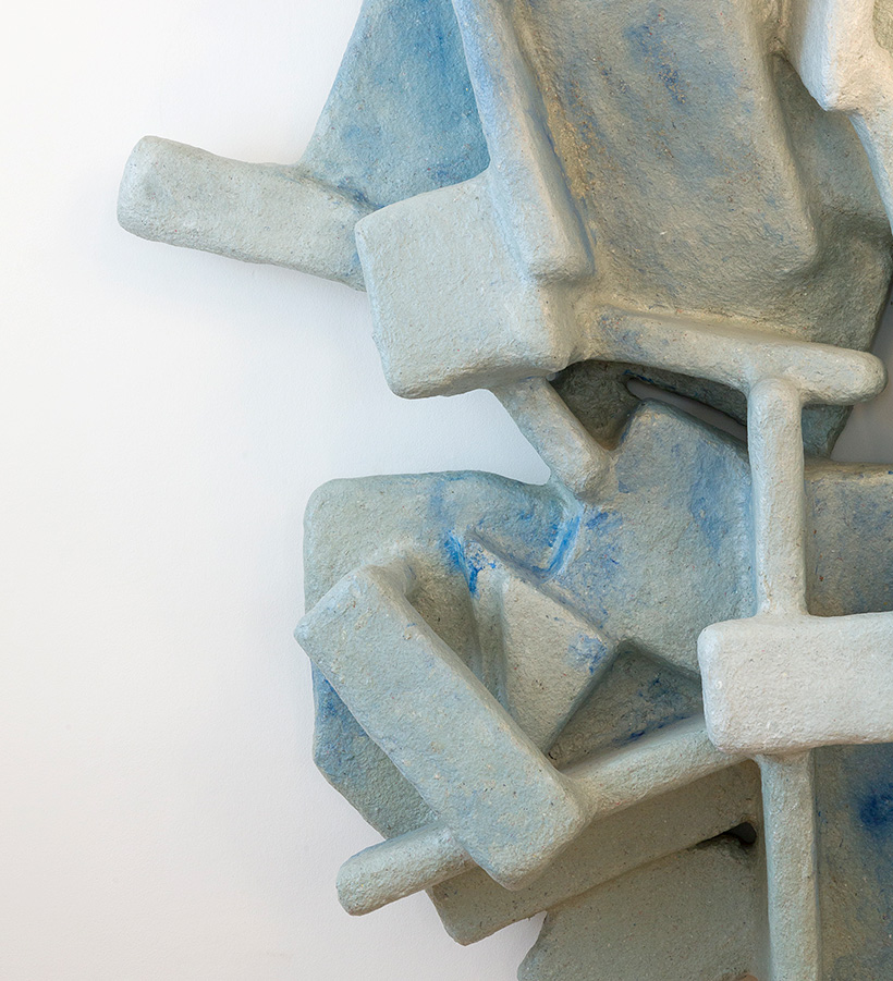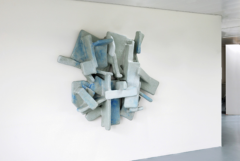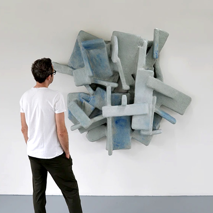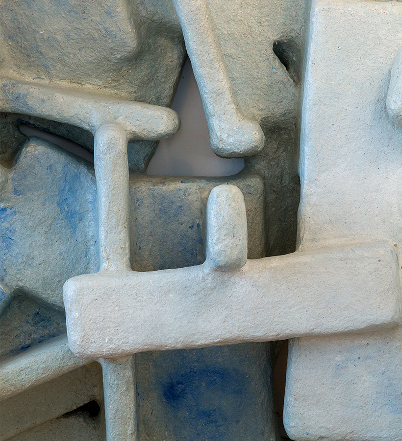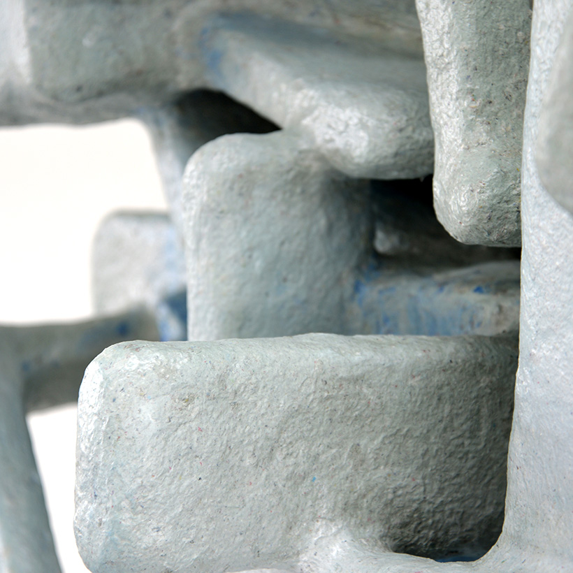 The wall sculpture "Vertical Formation" is inspired by urban spaces. Materials such as wood, paper and foam board are combined with a composite material and formed over structures inspired by architectural spaces. With the work, the designer translates the complexity of cities and the way we move through them.
