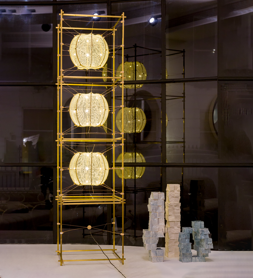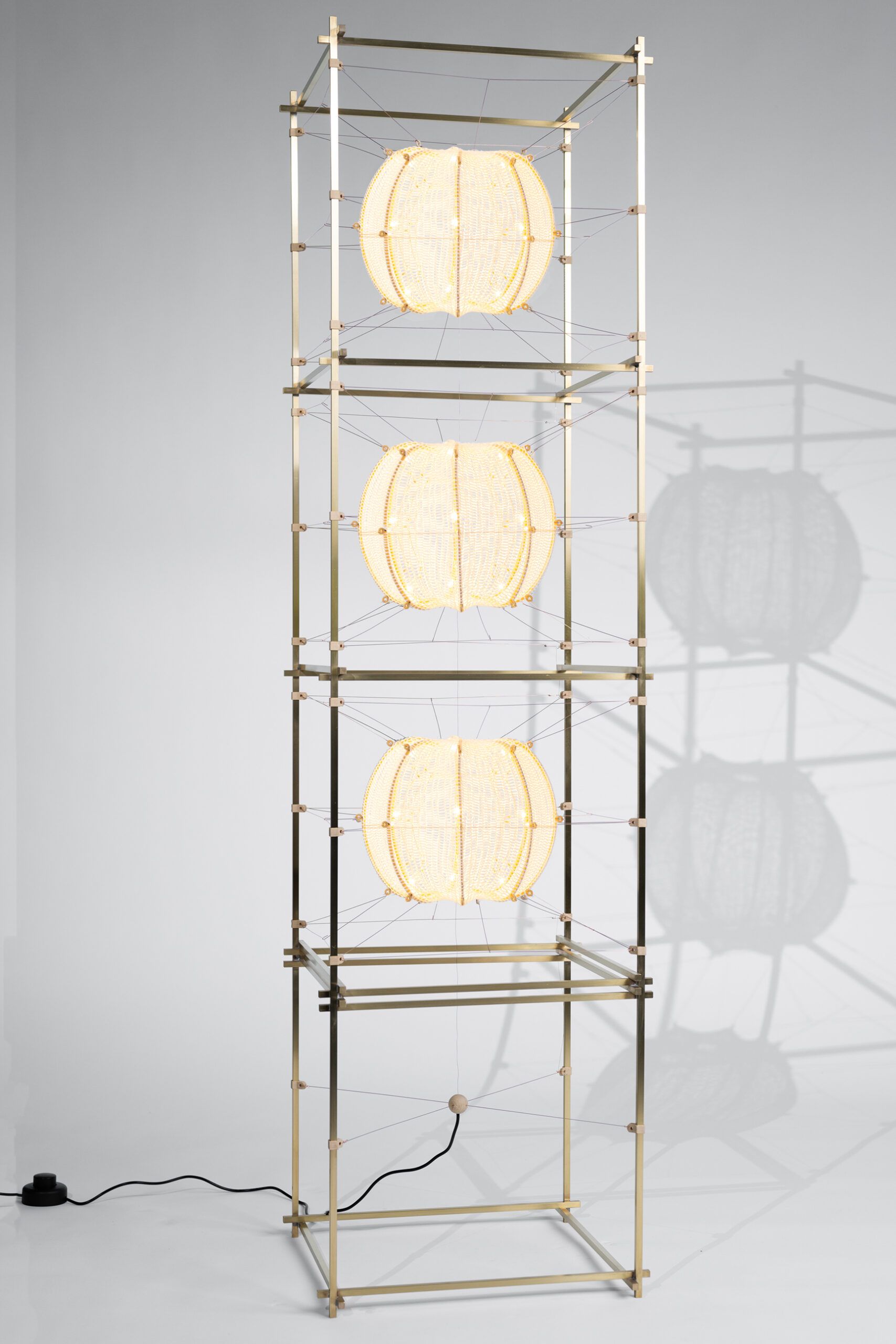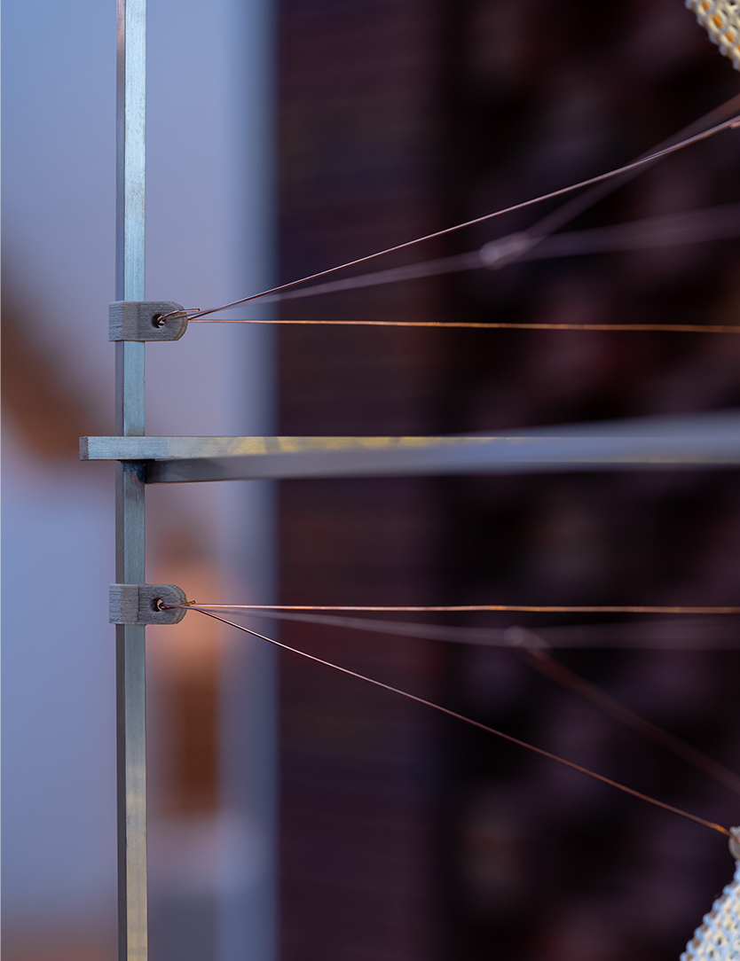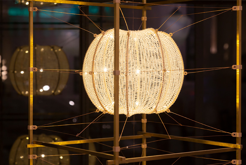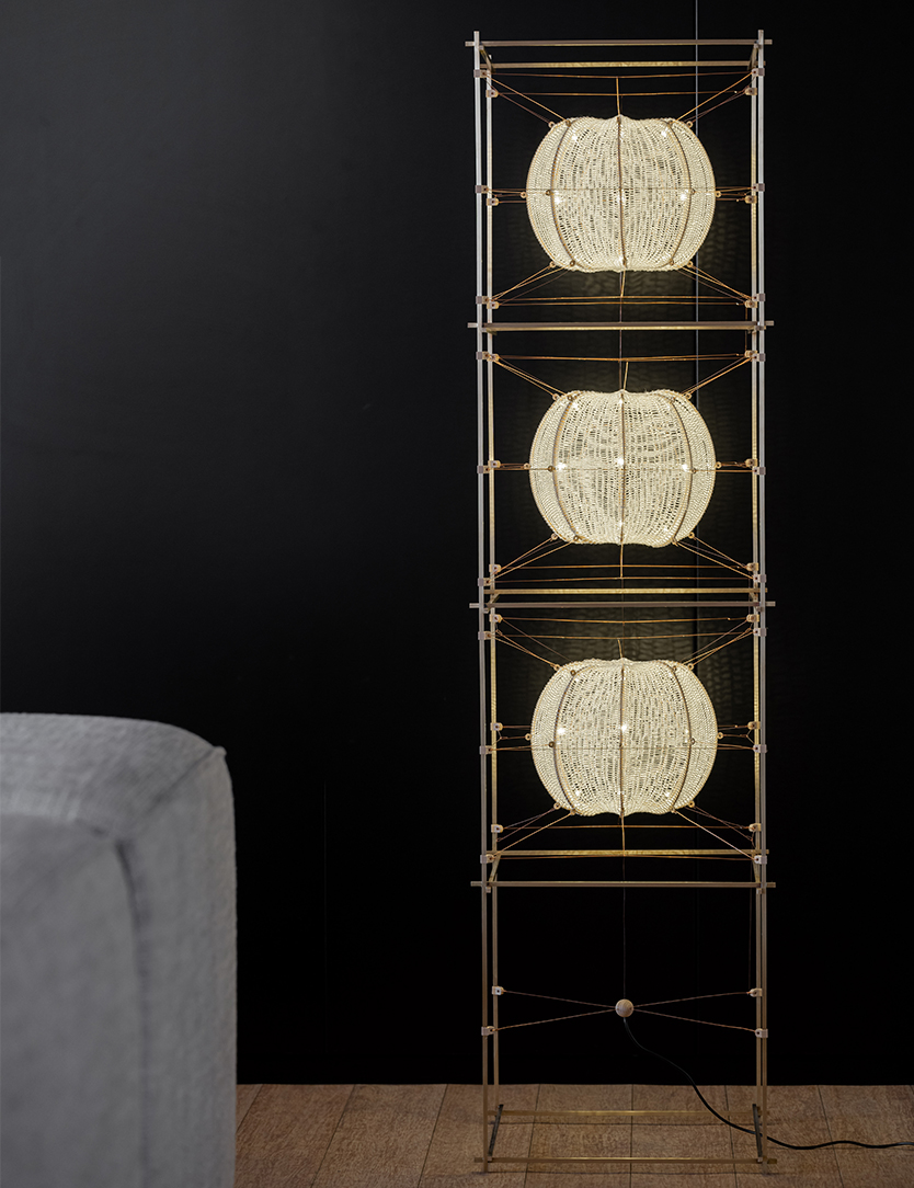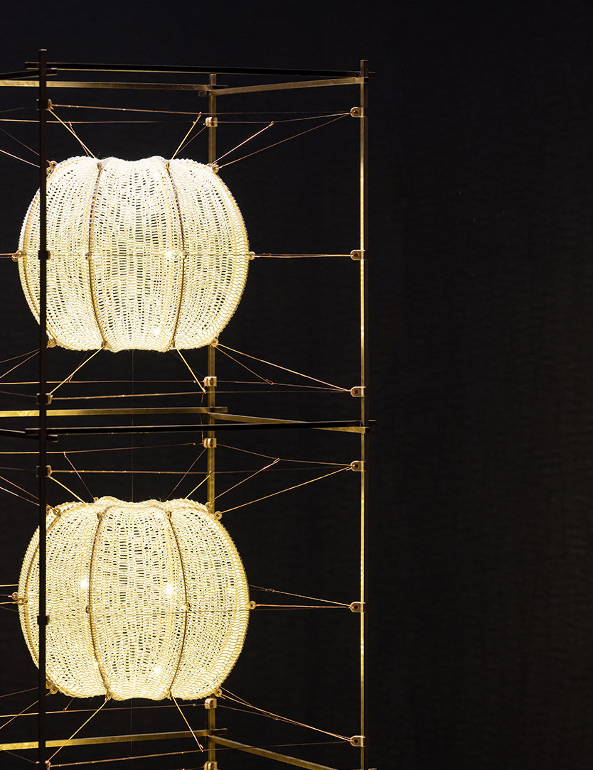 Jewellery for your home - 'Volare' is a series of unique light objects where soft knitted cylinders of pure silk float in a solid frame. This tension is created with 3D printed shapes and copper wire, that simultaneously act as an electrical conductor. The light is diffused through ‘cocoons’ in beautiful patterns. The design combines authentic craft with automation and electrical engineering.