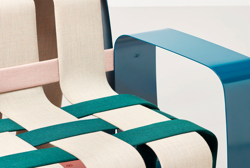 The Woven Armchair is the result of a close study of the Kvadrat Canvas textile. The designer was inspired by the strength that weaving imparts to the fine wool fibres, the tactile quality, and the optical effects of unexpected colour combinations. Each different strip of metal has been covered in a different colour of the Kvadrat Canvas textile, adding to the feeling of softness. A solid powder-coated steel base provides a structure for the woven pieces helping to create the finished shape.
